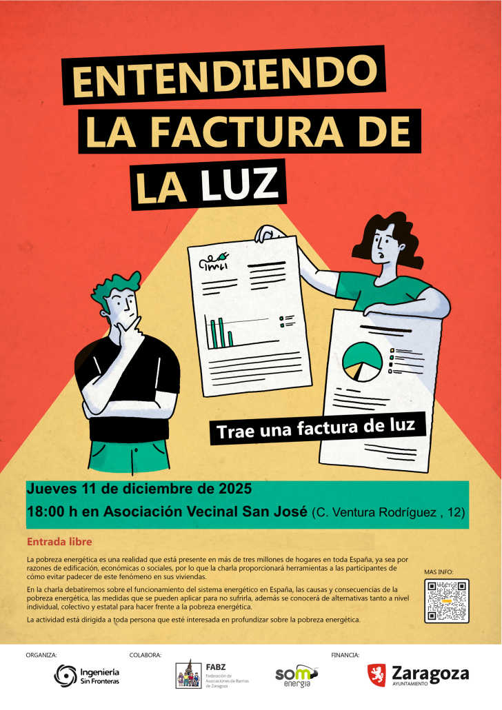 Ingeniería Sin Fronteras Aragón, con la financiación del Ayuntamiento de Zaragoza organiza de nuevo la charla “Entendiendo la factura de la luz”, esta vez en en la asociación Vecinal de San José.